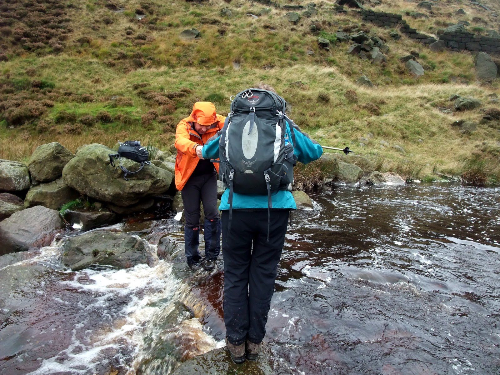 From here we follow Greenfield Brook to where we have a spilt. We are going to take the right split up Birchen Clough. So this is where the fun starts. With the heavy rain during the day before and though the night. The brook is now a raging brook of brown water. What in the summer you can jump on the stones or paddle across in inch water. Is now a foot of more fast flowing river. The grit stone rocks have lost the grip. So with a lot of up and down the brook looking for a spot to across. At one point it did look, as we have to turn back. But we found a spot to across with helping hands and poles. Team building.